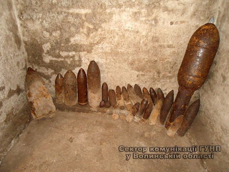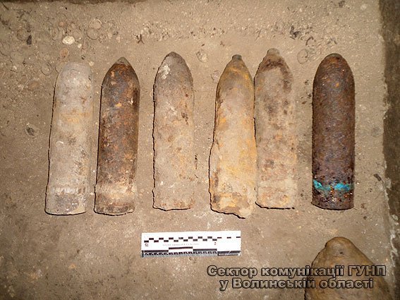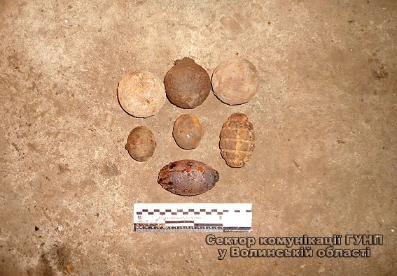 «У чоловіка в погребі виявили та вилучили корпуси гранат «Ф-1», «РГД-33», три корпуса англійських гранат «№15» та корпус гранати «№16» 1915 року випуску, два корпуси гранати «Eihandgrenata» 1917 року випуску, три корпуси англійської оборонної гранати дистанційної дії системи “Мілса” № 5, 1915 року випуску. Окрім того, в громадянина поліція вилучила також один бронебійний артилерійський снаряд 48мм, вісім шрапнельних артилерійських снарядів 76мм, шість осколково-фугасних артилерійських снарядів 76мм, два осколково-фугасних артилерійські снаряди 100мм, один осколково-фугасних артилерійський снаряд 122мм, два осколково-фугасних артилерійські снаряди 150мм, одну авіаційну бомбу калібром 250мм, один реактивний фугасний снаряд 280мм», - розповів Ігор Заболотний, начальник вибухотехнічного відділу ГУНП у Волинській області.
