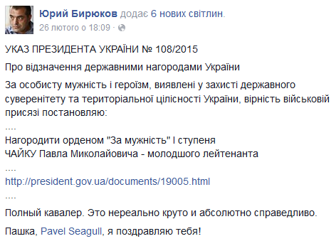 Радник Президента Юрій Бірюков висловив своє захоплення подвигами Павла на своїй сторінці у Фейсбуці.