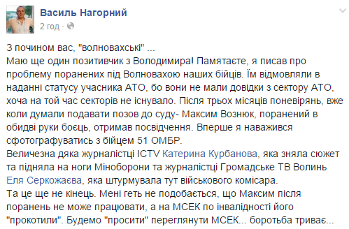 Статус учасника бойових дій волинянин Максим Вознюк, який постраждав у трагедії під Волновахою, таки отримав. Про це на своїй сторінці у Фейсбуці написав волинський адвокат та волонтер Василь Нагорний.