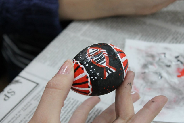 Вона розповіла, що в давнину яйце, призначене хліборобові, розмальовували чорним кольором. Цей колір позначав весняну землю, що прокидається від зимового сну. Червоний колір позначав небесний вогонь, чоловічу силу, здоров’я, любов, владу.