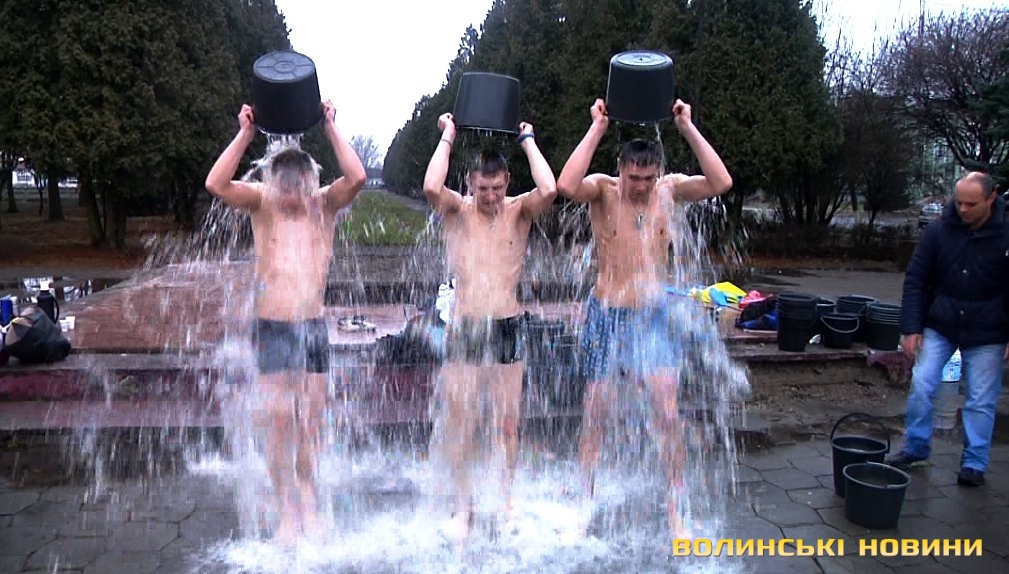 Обливалися волиняни у Любомлі. Так, наші краяни продовжили акцію «Ice bucket challenge» «зігріває солдатів».Нагадаємо, що акцію «Зігрій солдата» започаткували волонтери для підтримки солдатів-земляків. Відбувалося це на третій день Різдва. Керівник громадської організації «Християн-волонтерів», організатор акції Андрій Демянчук розповідав, що суть її у тому, щоб на очах у глядачів сміливо облитись відром крижаної води, віддати на армію 100 гривень та передати естафету наступним учасникам. Якщо ж учасник відмовлявся обливатись, мав віддати армії 500 гривень.