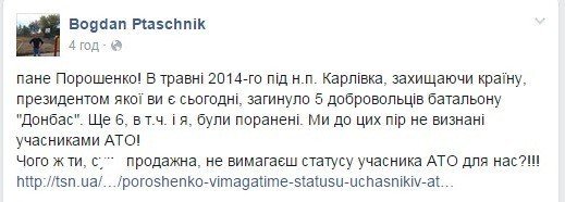 "Крок Пороха - це плювок в обличчя мені і таким як я. І плювок на могили моїх загиблих побратимів. Вони (владці, - авт.) останнім часом виключно на крові і піаряться!", - прокоментував рішення Порошенка волинський доброволець.