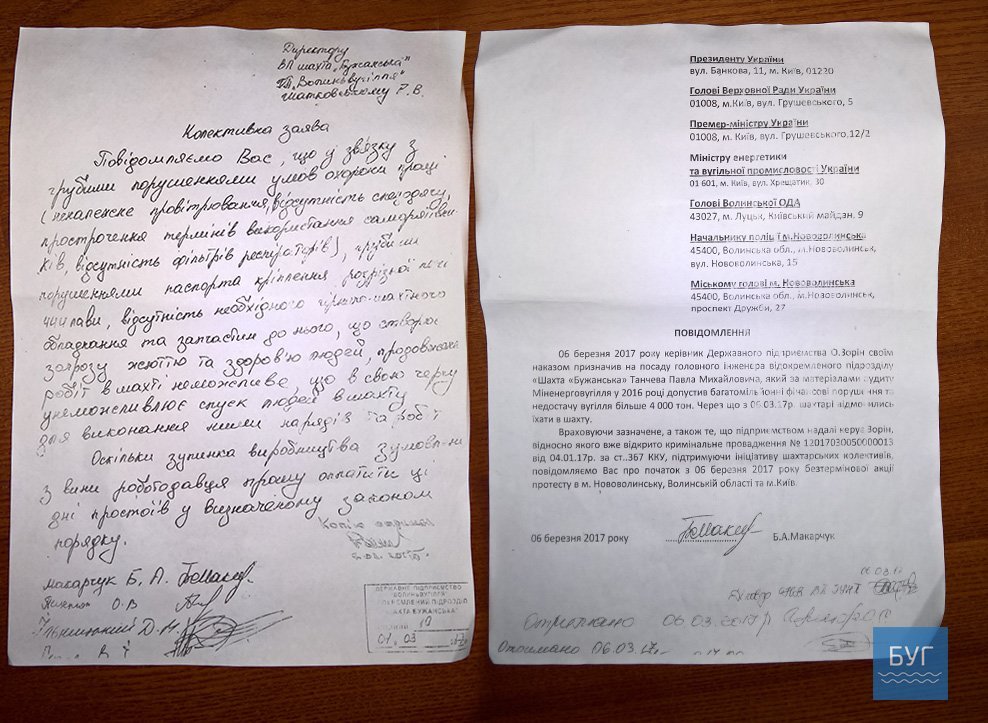 Гірники шахти “Бужанська” написали директору копальні Руслану Шатковському колективну заяву. Повідомили, що у зв’язку з недотриманням умов охорони праці, через грубе порушення паспортного кріплення розрізної печі 444 лави, відсутність необхідного гірничошахтного обладнання та запчастин до нього, продовження робіт у шахті неможливе.
