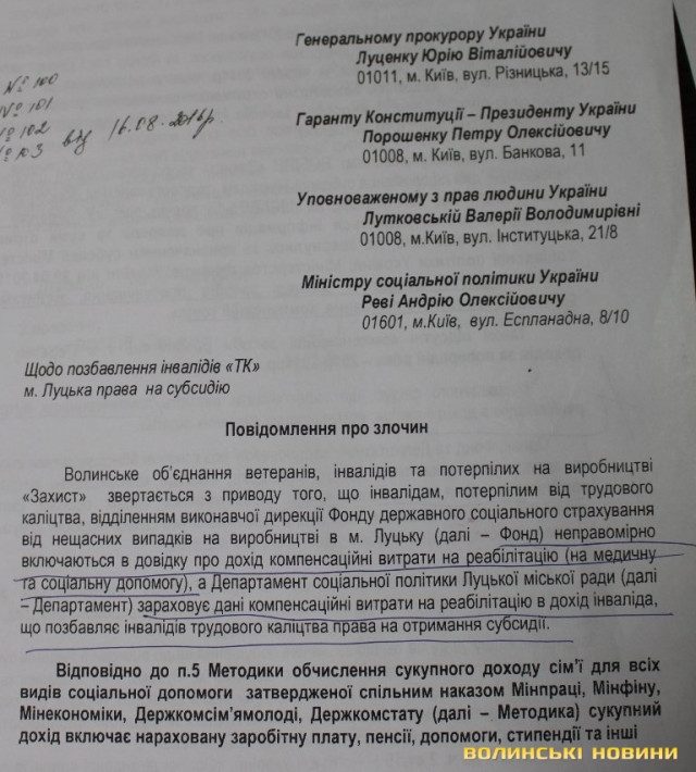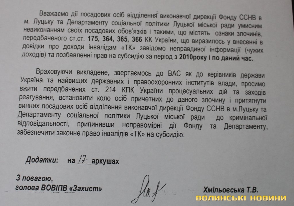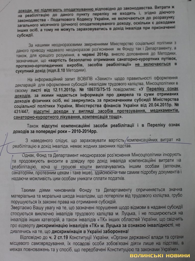 «Фонд державного соціального страхування від нещасних випадків на виробництві в місті Луцьку неправомірно включають в довідку про дохід компенсаційні витрати на реабілітацію, а департамент соціальної політики Луцької міської ради зараховує компенсаційні витрати на реабілітацію в прямий дохід інваліда, що позбавляє права на отримання справедливої субсидії. Такими діями чиновників Фонду та Департаменту спричиняється значна матеріальна та моральна шкода інвалідам, що потерпіли від трудового каліцтва, грубо порушуються їх законні права на отримання субсидій», - написано в листі.Коментуючи цю конфліктну ситуацію, заступник директора департаменту соціального захисту населення Волинської ОДА Людмила Сірбіненко пояснює, що конфлікт можна вважати вичерпаним, бо Кабмін вніс зміни, за які так боролися громадські активісти. Відповідно, субсидія буде більшою для травмованих на роботі, бо соціальна допомога не враховується в дохід.