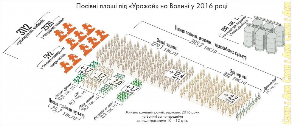 Загалом на Волині засіяли понад 285 тисяч гектарів зернових, що на 15 тисяч гектрів більше, ніж торік. Зерно достигло вчасно, полеглих площ майже немає. Тому хлібороби пророкують багатий урожай. Принаймні більшість господарств сподіваються на середню врожайність у 35–50 центнерів озимого ячменю з гектара, 35–45 центнерів із га озимої пшениці, 40–60 центнерів ріпаку і тритикале.