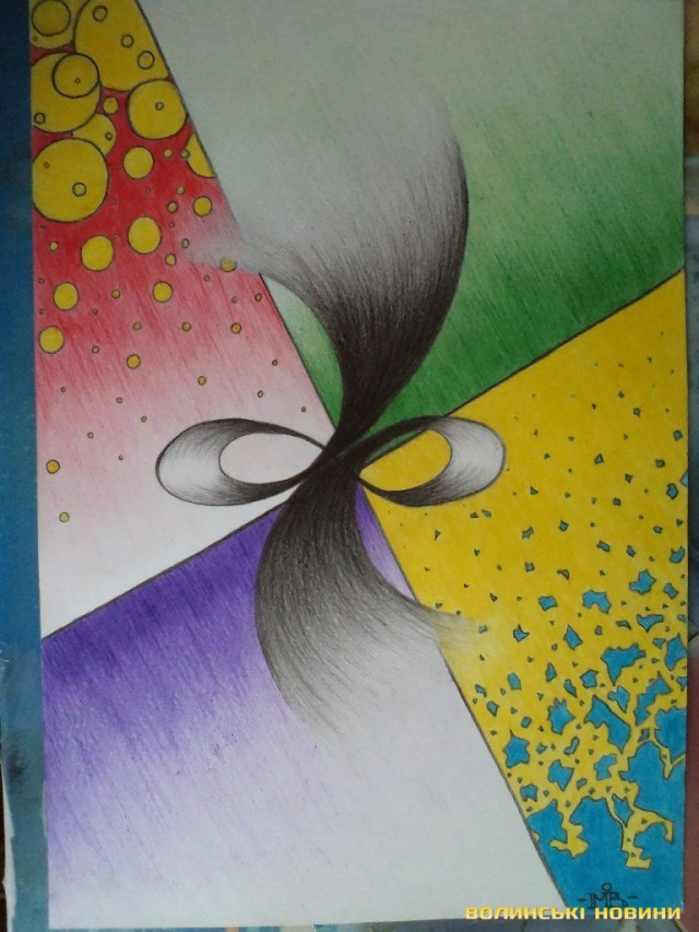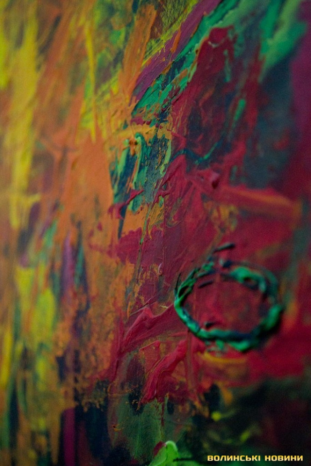 «Я почав малювати з 2000-го року. Спочатку пробував графіті, бо тоді було так модно, а потім перемикнувся на абстракціонізм, який і зараз продовжую просувати в маси. Особливої освіти не маю. Усьому навчився сам. Малюю переважно кольоровими олівцями. Неодноразово брав участь у виставках, що проходили у Луцьку. На із них здобув гран-прі та особливу відзнаку від журі. Наразі пропоную для огляду власну картину під назвою «Трансформація». На ній я спробував відобразити поєднання і перевтілення інших вимірів у щось одне спільне», - каже один із учасників виставки лучанин Володимир Міцевський. Зі слів молодого художника-абстракціоніста, хлопець часто чує від людей, мовляв, «що це таке і що воно означає»: