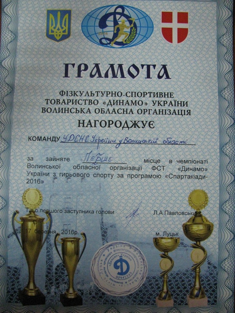Чемпіонат з гирьового спорту серед колективів фізичної культури правоохоронних органів за програмою «Спартакіади – 2016» Волинської обласної організації ФСТ «Динамо» України відбувся сьогодні, 17 березня, в спортивному комплексі ФСТ «Динамо».