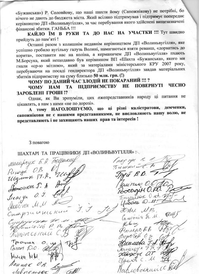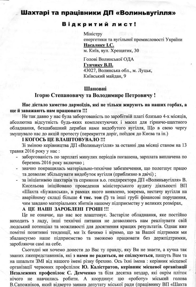 Волинські шахтарі виступили проти своїх «лжепредставників». ЛИСТ