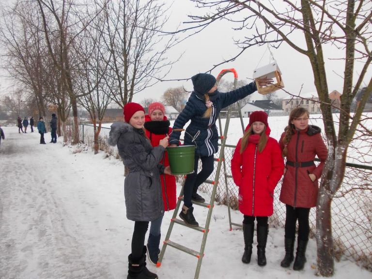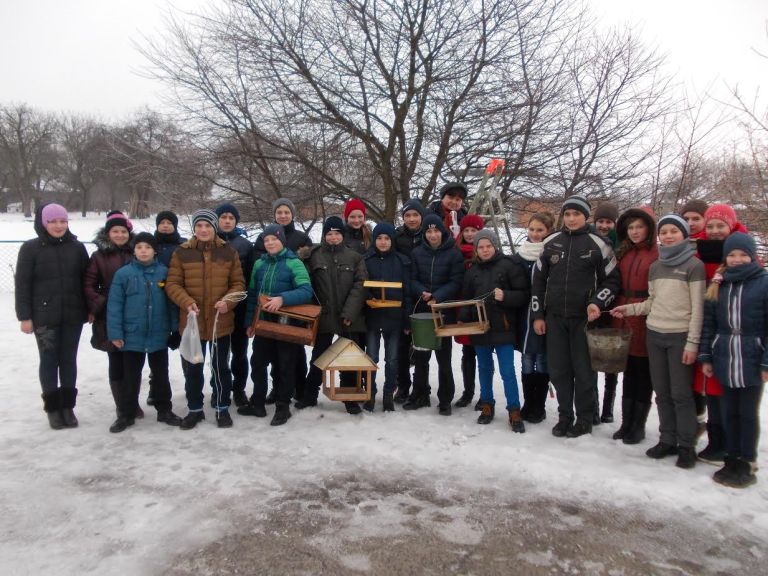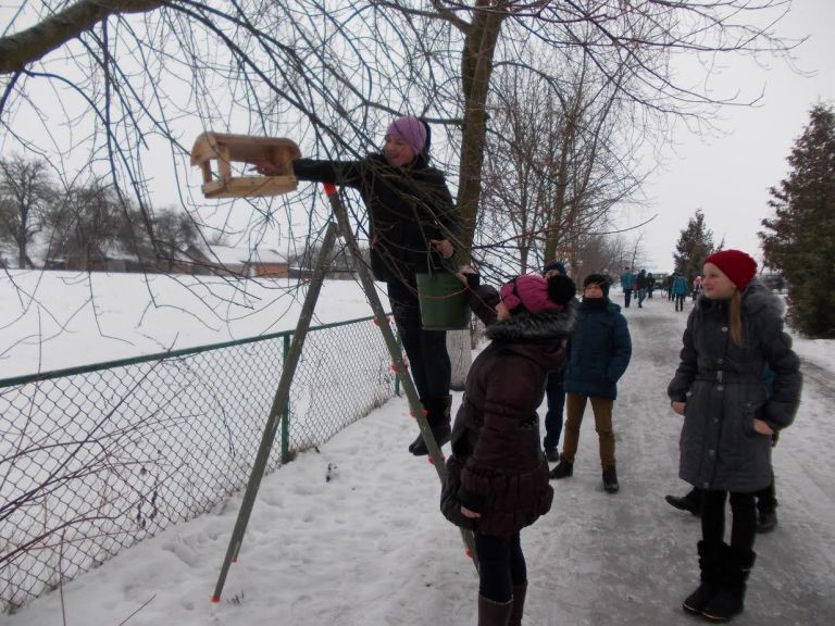 Цьогоріч зима щедра на сніг і люті морози. Різноманітне птаство у такі холодні дні злітається поближче до осель, щоб тут відшукати собі поживу. Рясно обсіли пернаті друзі дерева та кущі і навколо школи. Юні природолюби на чолі із їхнім керівником Петром Антонюком вийшли із власноруч змайстрованими годівничками та зерном. Понад 10 таких їдалень для птахів прилаштували високо на гіллі та насипали туди їжі. А для синичок почепили запашне несолене сало, яке ці птахи так полюбляють. Знають-бо школярі про користь від пернатих, які знищують чимало шкідників на деревах. А нині діти залюбки доглядають, щоб корм не закінчувався та спостерігають, як птаство радісно злітається до їхніх годівниць.