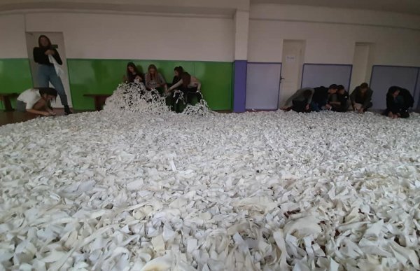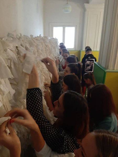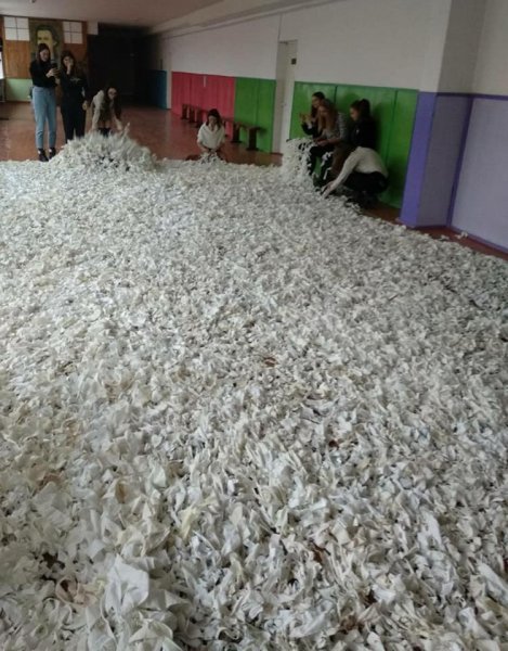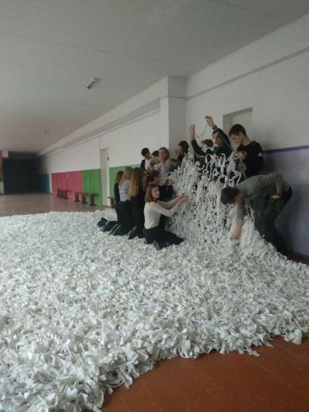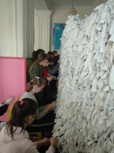 Кілограми білої тканини, яку принесли з дому учні й вчителі, потрібно було порізати, порвати на маленькі клаптики для того, щоб, застосовуючи техніку «бахрома», створити величезне біле полотно розміром 8×12 метрів. Основу для сітки було придбано за кошти школи з допомогою громадської організації «Храм надії».«Упродовж двох тижнів Виховний центр і фоє школи перетворилися на майданчик активних дій. Не лякали ні постійний гамір, ні сміття, яке залишалося після використаної тканини. Активісти кожного класу на перервах і після уроків поспішали вкласти тепло своїх сердець та побажання миру і добра захисникам України у маленькі білі клаптики, які зав’язували на кожному вузлику сітки – приблизно 38 тисяч вузликів. Працювали дружно, завзято, сповнені розуміння хай маленького, але важливого вкладу в збереження миру», – йдеться у дописі.