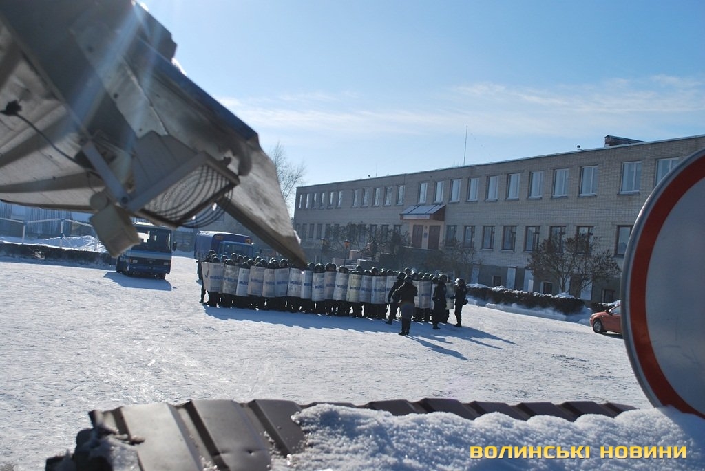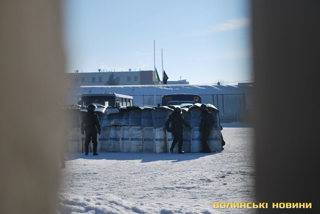 Поки що силовики тренуються на плацу. Вони грюкають у щити та формують оборонні та наступальні фігури, інформує власкор Інформаційного агентства Волинські Новини. За парканом чути рев мотору.