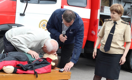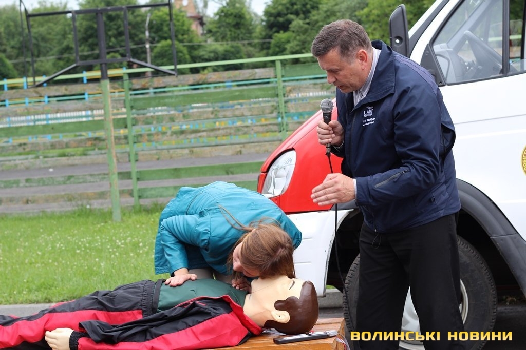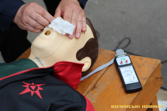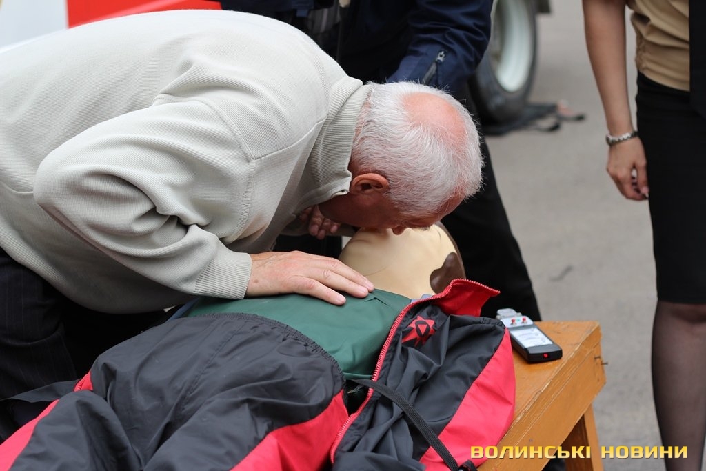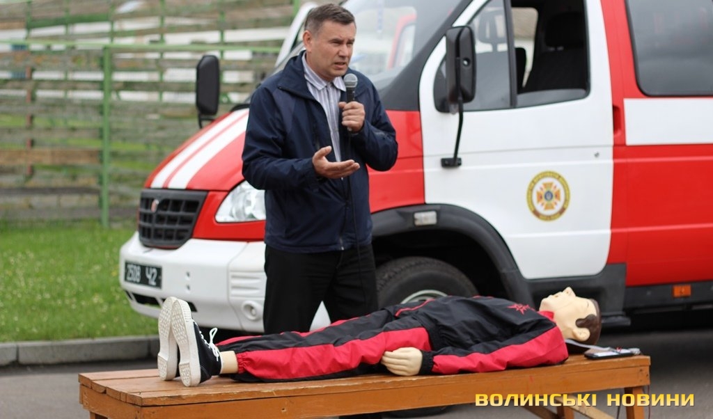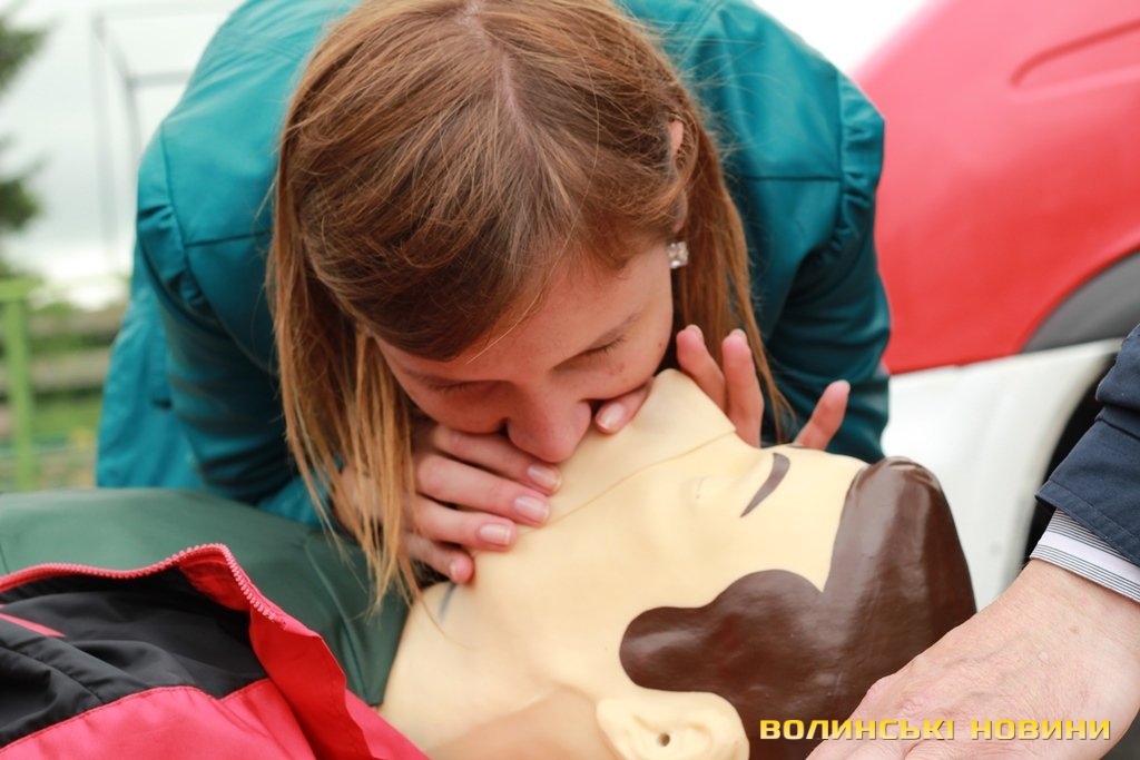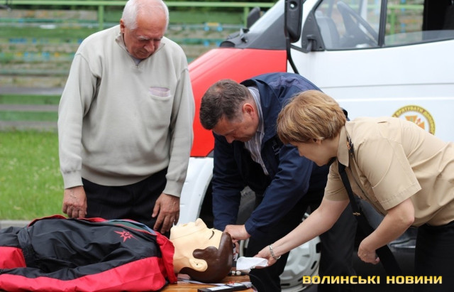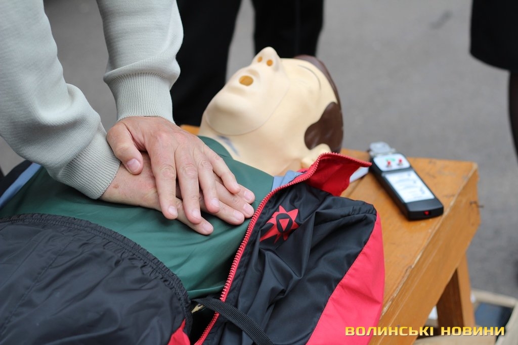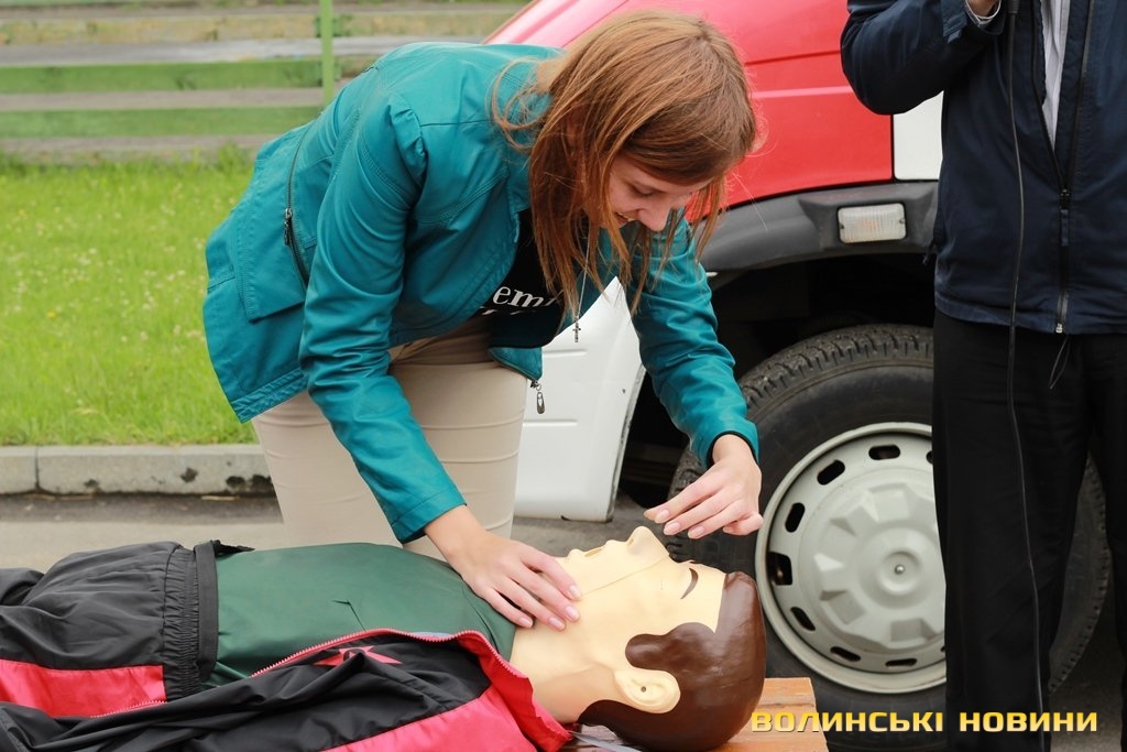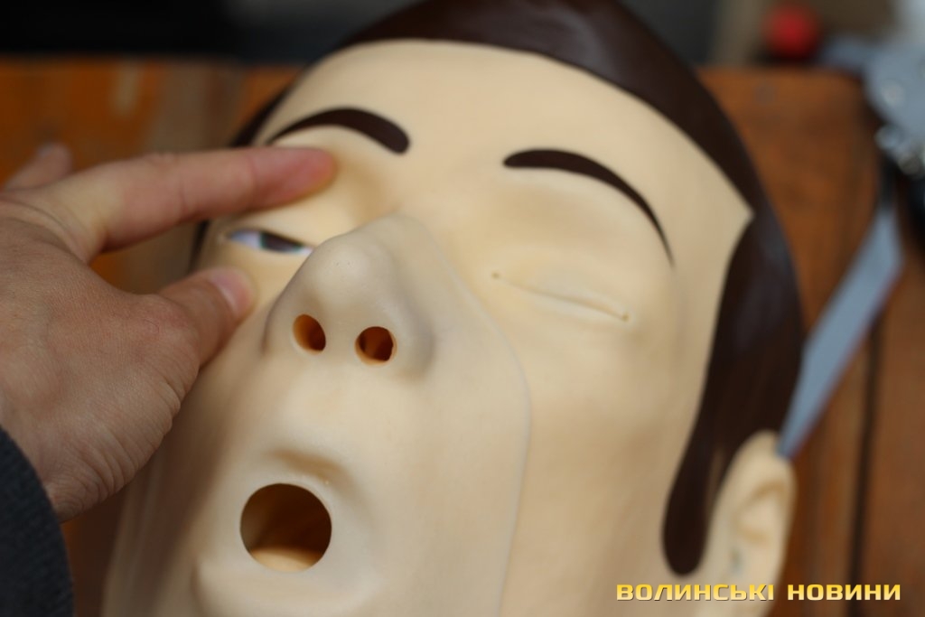 «У рамках європейського гранту ми отримали два манекени й обладнання, аби навчати волинян надавати першу невідкладну допомогу й проводити агітацію щодо дотримання правил пожежної безпеки. Почали ми свою роботу торік, уже пройшли курси понад 10 тисяч краян, які на Максимі вправлялися підтримувати в людині життя до приїзду швидкої», - розповідає «тато» Максима - голова добровільного пожежного товариства Волині Григорій Загородній.Для початку непритомному Максиму підклали під голову кофту, аби вирівнялася гортань. Це, кажуть, необхідно, щоб під час штучного дихання повітря потрапляло в легені, а не в шлунок. Потому з манекена зняли верхню кофту, закрили ніс й провели два вдихи в рот. Щоб здійснити непрямий масаж серця, від сонячного сплетіння відміряли відстань у два пальці й поклали туди руки. Тиснути на грудну клітку необхідно зі швидкістю два рази в секунду. Вона має прогинатися до 5 сантиметрів. Фахівці кажуть, що бувають випадки, коли ламаються ребра, однак це не є причиною для паніки, адже життя людини врятоване. Після 30 рухів над серцем, необхідно повторити штучне дихання. Аби руки не втомлювалися під час масажу серця, – рекомендують тиснути вагою тіла.