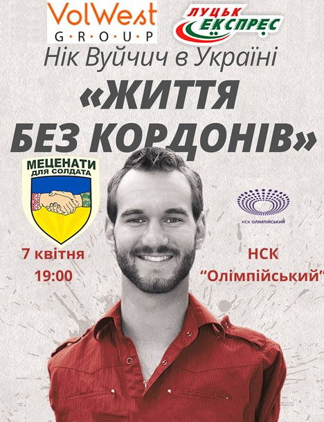 Відомий мотиваційний тренер, який народився без рук та ніг, – Нік Вуйчич – завітає до Києва на зустріч із волинськими бійцями.