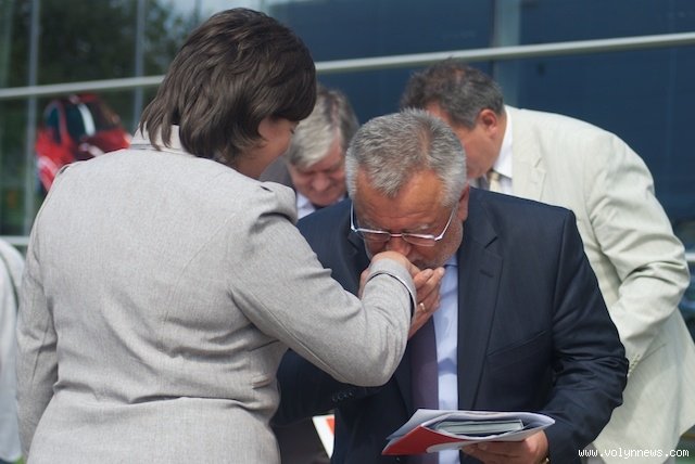 Генеральний директор ПАТ «Волинь-АВТО» Юрій Корольчук та голова Волинської обласної державної адміністрації Борис Клімчук урочисто передали пакет документів та ключі від автобусів начальникам районних відділів освіти.