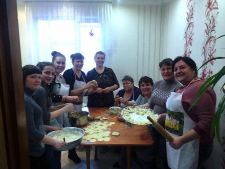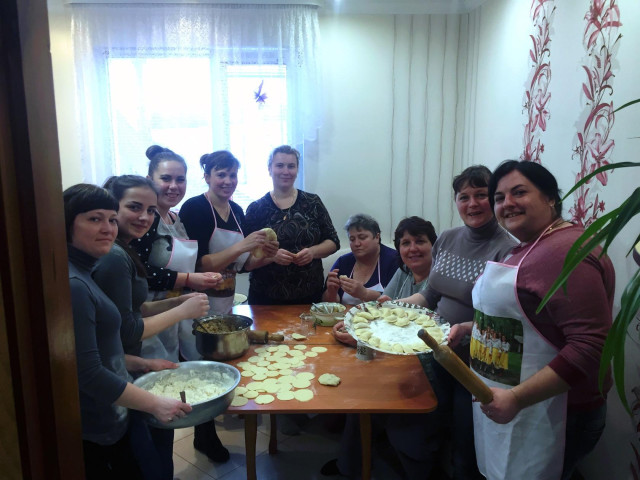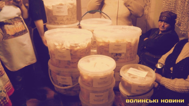Вісімнадцять ініціативних господинь зібралися в домівці Світлани Гончаревич, позносили власні продукти і цілий день ліпили та варили смачні вареники з сиром, картоплею та капустою, складали у пластмасові відра та заливали смальцем.