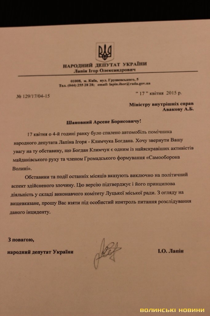 а чому писати Авакову ? все одно підпал буде розлідувати луцька міліція : -писати треба муковозу або для контроля шпизі : Шо авакову мало проблем -йому зараз не дотого