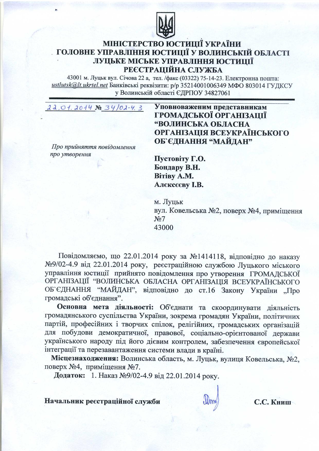 Громадську організацію «Волинська обласна організація всеукраїнського об’єднання «Майдан» офіційно зареєстрували у відповідній службі головного управління юстиції в області. Про це повідомили представники організації.