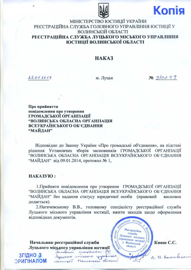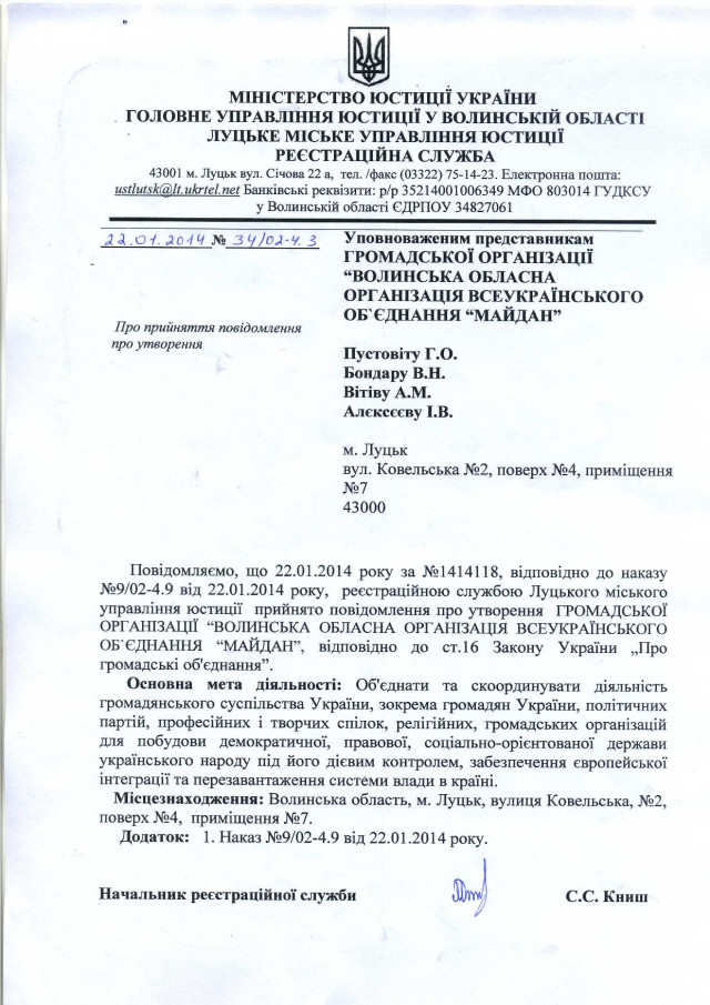Документи, які підтверджують офіційну діяльність новоствореної громадської організації на Волині, – подані нижче.