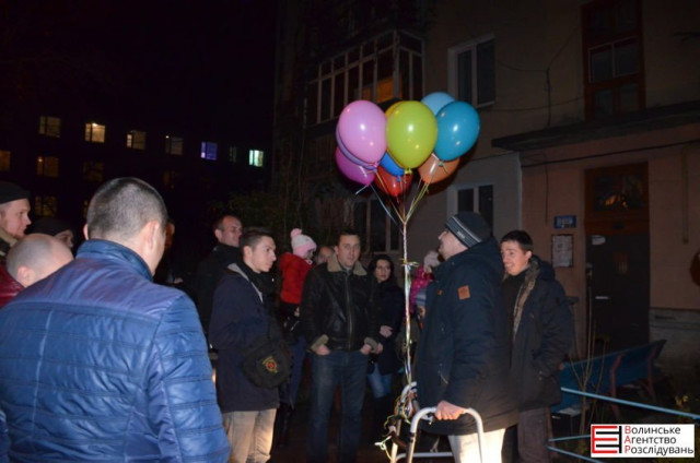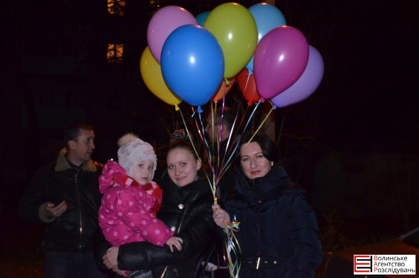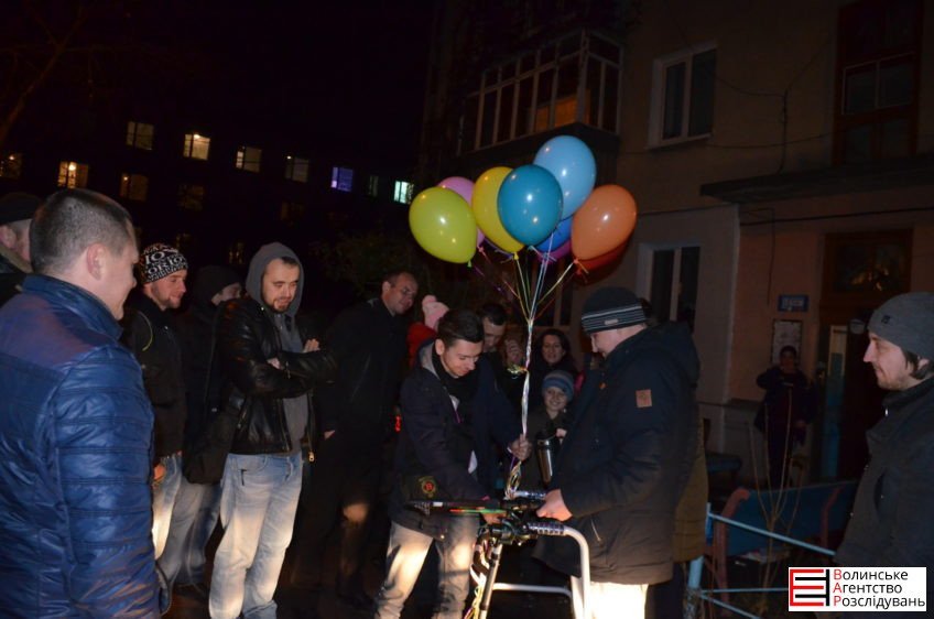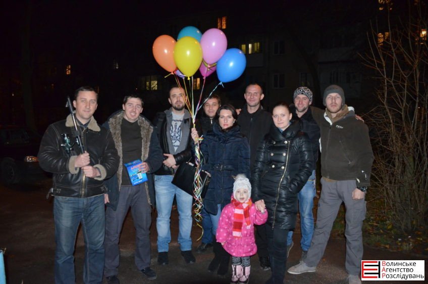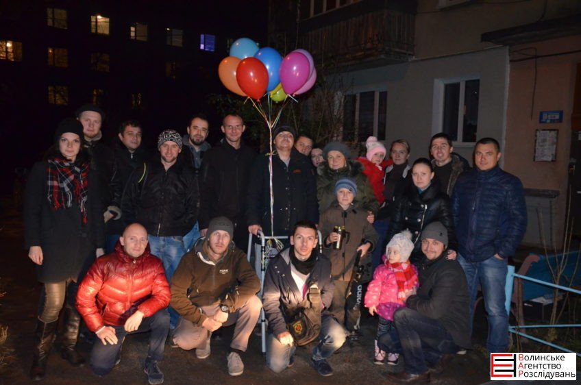 Зустрічати волонтера прийшли його друзі, родичі та члени громадської організації «Автомайдан України. Луцьк». Друзі принесли йому подарунки, кульки та цукерки «Ліщина».