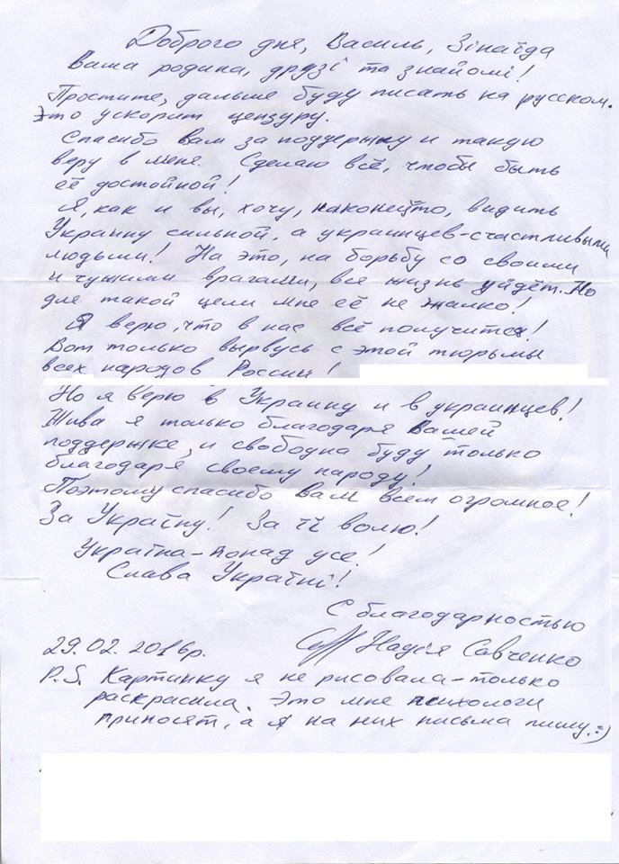 У листі Надія дякує пану Василю за підтримку і віру. А також пише, що їй не шкода життя віддати за те, щоб Україна стала сильною, а українці - щасливими.