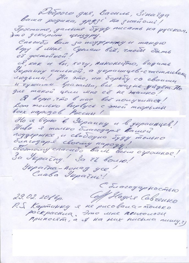 "...Я вірю в Україну та українців. Жива я тільки завдяки Вашій підтримці, і вільною буду тільки завдяки своєму народу!" - написала Надія Савченко.