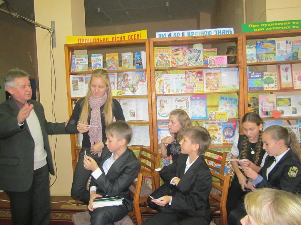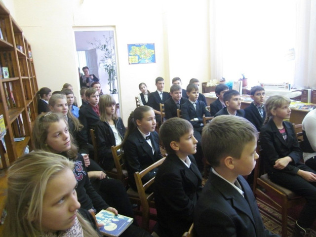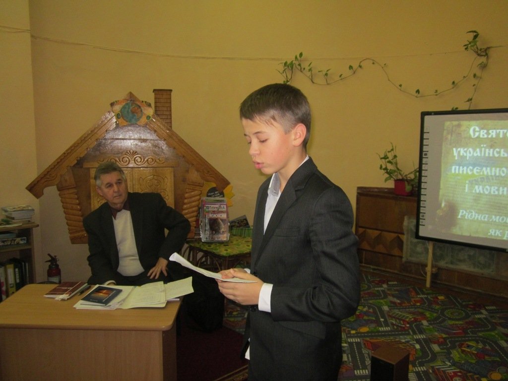 Для початку бібліотекар Ірина Гаджиєва розповіла про тернистий шлях, який пройшла наша мова, презентувавши «Історично-скорботний календар української мови». До уваги учні представили слайд-презентацію «Говоримо українською мовою», де відомі люди України висловлювали свої думки про значення і любов до української мови.