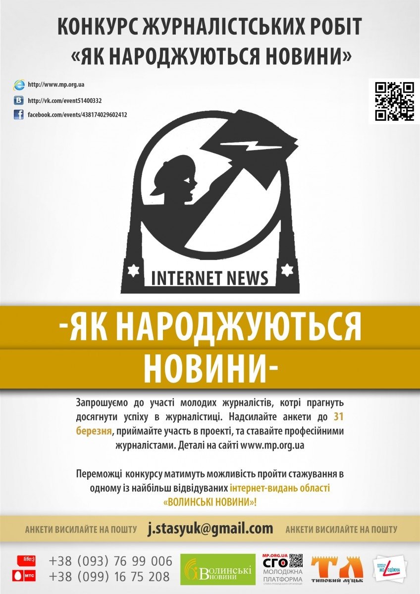Якщо ви захоплюєтесь журналістикою та хочете пов’язати з нею своє майбутнє, є терплячими та ініціативними, випробуйте власні сили. Переможці конкурсу матимуть можливість пройти стажування в одному з найбільш відвідуваних інтернет-видань краю – у редакції «Волинських Новин».