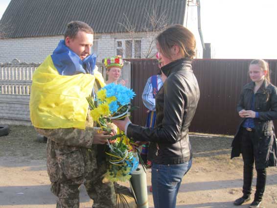 Майже рік пройшов з того часу, як з першою хвилею мобілізації, хлопець залишив рідних, друзів і пішов на схід, захищати рідну землю. Молитви односельчан, а особливо материнська молитва захистили і вберегли Сергія від ворожої кулі. Хоча пройшли роки після закінчення школи та Харківського національного політехнічного університету, вони не змінили юнака, він залишився таким же скромним, сором’язливим та привітним. А від зустрічі і гарних слів навіть трохи збентежився. Адже односельці, сусіди, друзі були дуже раді вітати на рідній землі свого захисника оплесками, квітами та вигуками «Слава Україні!». Старшокласниці, ледве стримуючи сльози радості, накинули на плечі Воїну прапор рідної країни.