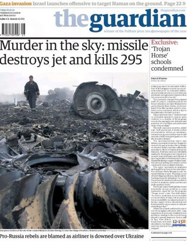 The Guardian: "Murder in the sky: missile destroys jet and kills 295 people" ("Вбивство в небі: ракета знищила літак і вбила 295 людей"