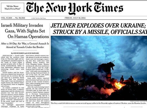 The New York Times: Jetliner explodes over Ukraine; struck by a missile, officials say" ("Лайнер взорвался над Украиной; пораженный ракетой, официальное заявление")