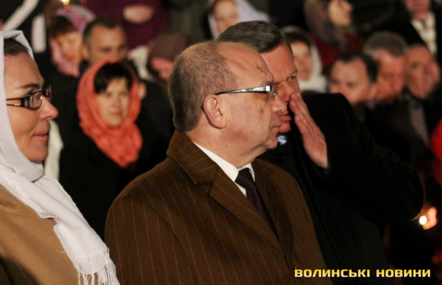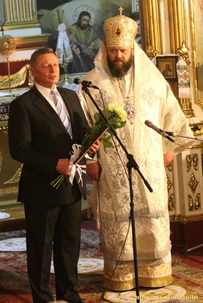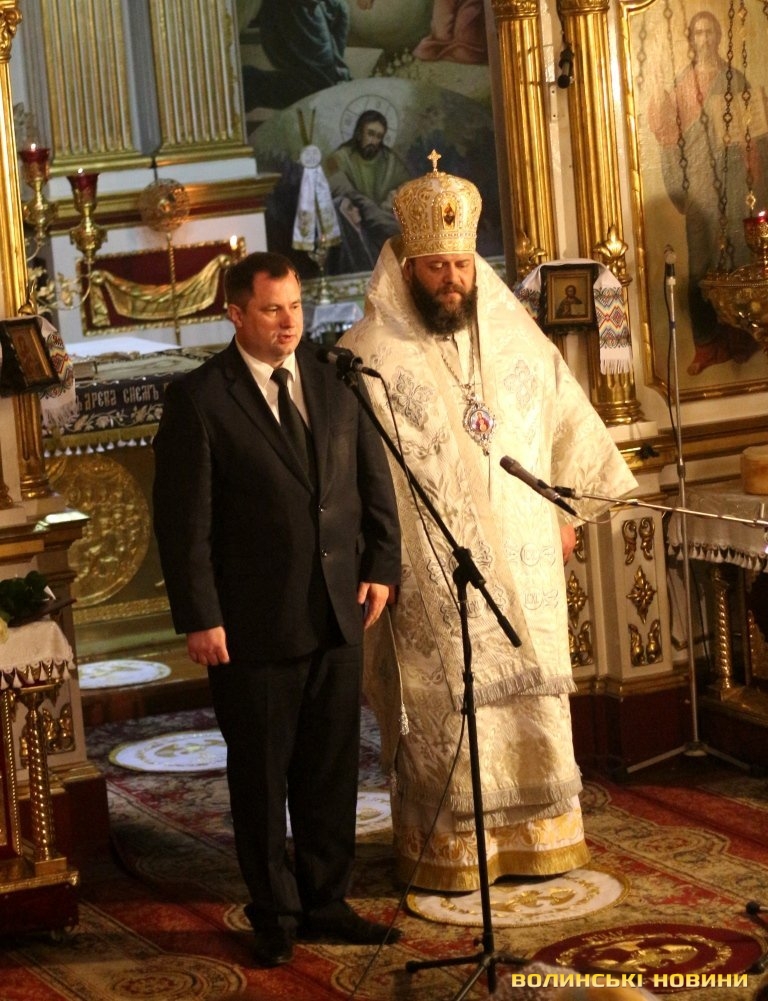 До вітань приєдналися представники обласної та міської влад. Голова облдержадміністрації Володимир Гунчик зауважив, що святкування відбувається у непростий час, але він побажав, аби в кожну волинську родину прийшли благодать, мир та злагода, а благодатний вогонь запалив у серці кожного надію на те, що наступного року це величне свято зустрічатимуть під мирним українським небом.Голова облради Валентин Вітер визнав, що Великдень – найвеличніше свято, що показує перемогу добра над злом, життя над смертю. У цей день, з його слів, ми повинні відчувати Божу підтримку в несенні хреста всієї України і кожного з нас – пекельної війни. Він висловив сподівання, що війна скінчиться нашою перемогою, а вояки повернуться в рідні домівки. Він подякував вірянам, які підтримували молитвами українських військових на сході.Луцький міський голова Микола Романюк побажав, щоб у кожну українську родину прийшов мир.Після привітань навколо храму вирушила хресна хода, яка завершилася освяченням пасок.