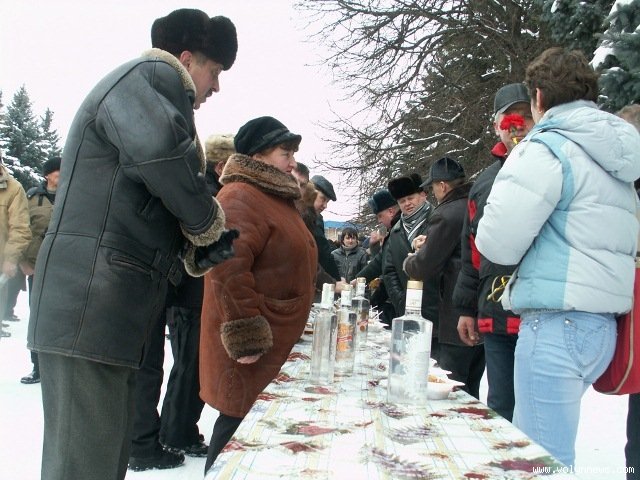 Дещо осторонь стояв білий бус. З автівки усім роздавали пляшки з горілкою, які відносили на стіл та розливали в пластикові стакани.