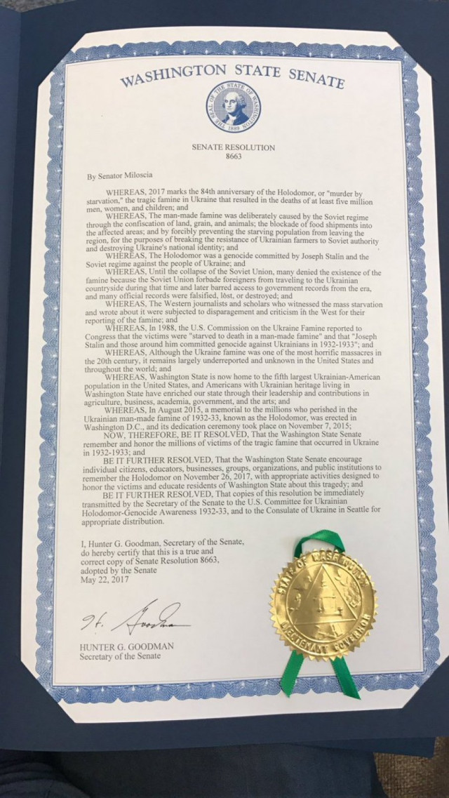 Вперше в історії США сенат штату Вашингтон прийняв резолюцію, в якій Голодомор визнано геноцидом українців. Про це повідомляє «Голос Америки».