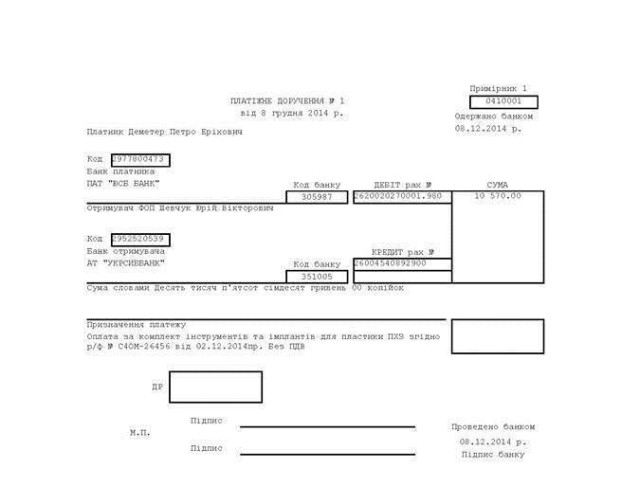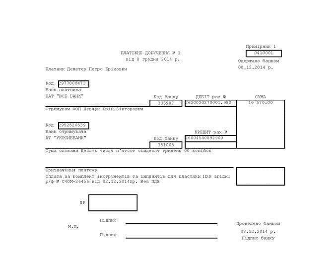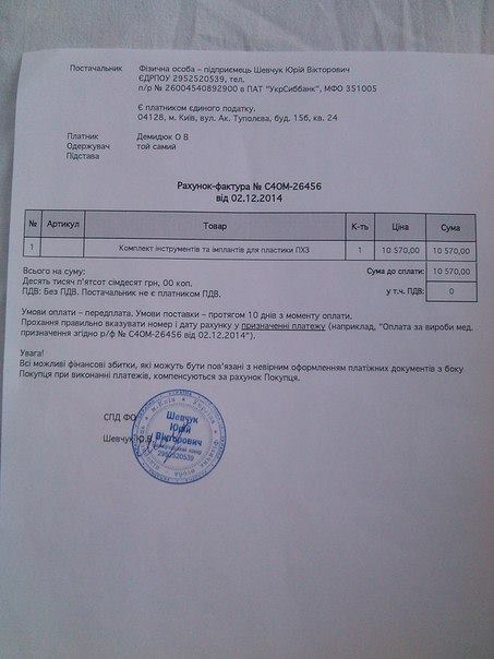 Під час операції використовували комплект інструментів та імплантів для пластики ПХЗ. Ціна комплекту - 10570,00 гривень.