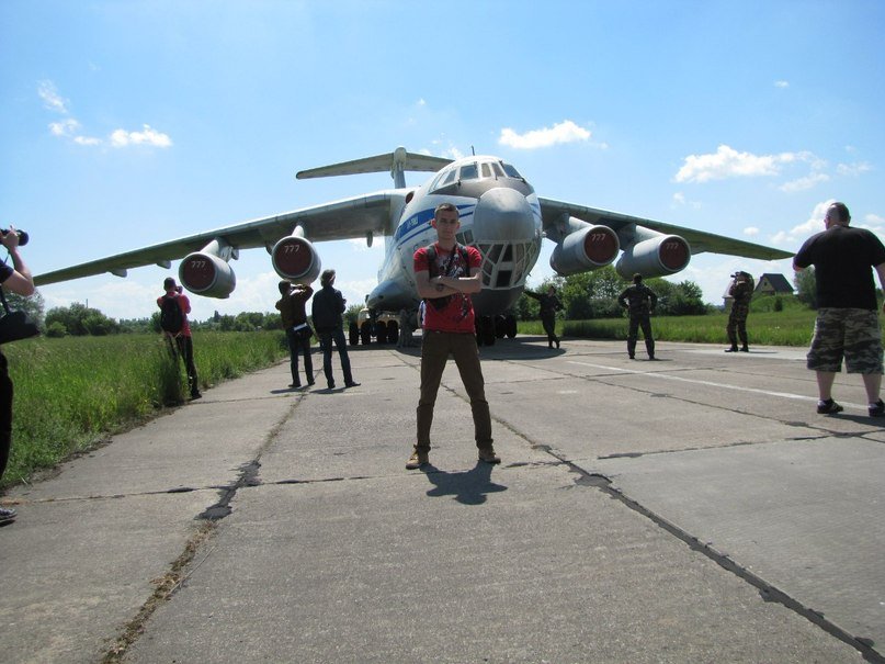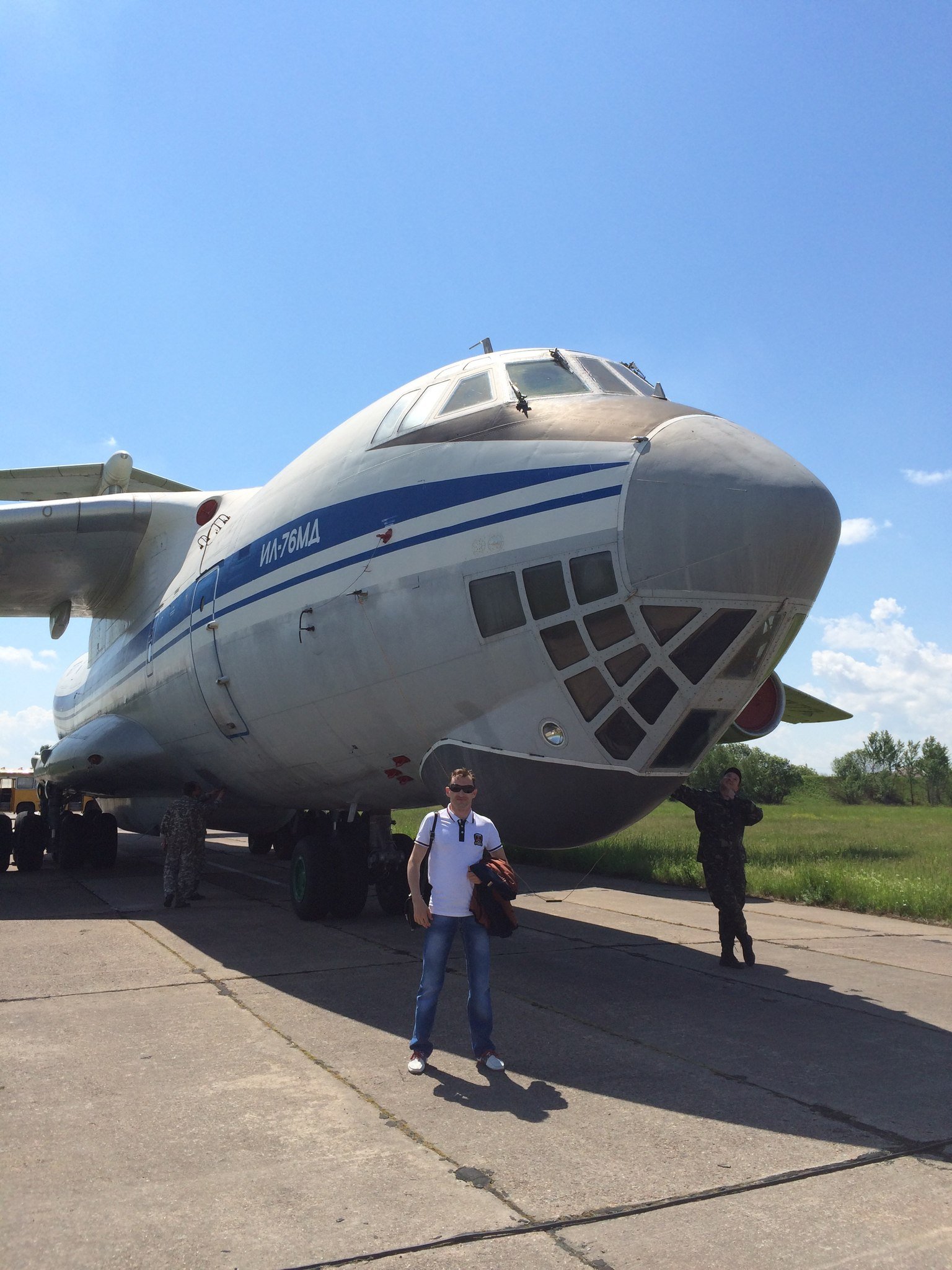 Разом з ним ми сіли в автобус і поїхали до літака. Поки ми фотографувалися біля Іла, Саша відкрив бортовий люк і опустив трап. По ньому ми піднялися у вантажний відсік Іла, потім пройшли в кабіну екіпажу. Весь цей час Саша спокійно і з посмішкою відповідав на запитання, які сипалися на нього градом, розхвалював літак, який був одним з найбільш "молодих" в усьому авіапарку Іл-76МД на Україні, із захопленням розповідав про закордонні місії, в яких йому пощастило побувати, зокрема про польоти в Гренландію під данським прапором, коли на цьому літаку вони перевозили на науково-дослідні станції крижаного острова паливо, обладнання та медикаменти. Також розповідав про сьогоднішню ситуацію в Україні, про інтенсивні польоти, які тривають вже 4 місяці практично без посадок. Незважаючи на сильну втому, Саша виглядав бадьоро і тримався підтягнуто, як і личить справжньому офіцеру. Наприкінці екскурсії ми майже подружилися. Саша був лише на два роки старший за мене, 1984 року народження. На прощання я потиснув йому руку і подякував за приділений час, побажавши йому чистого мирного неба та м'яких посадок.