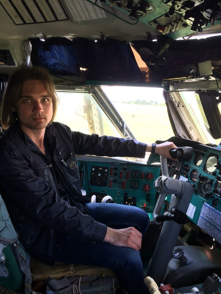 На фото: член "ОВАЛ✈" Ілля Сметанін в кабіні екіпажу й на фоні збитого Іл-76МД з бортовим номером 76777.