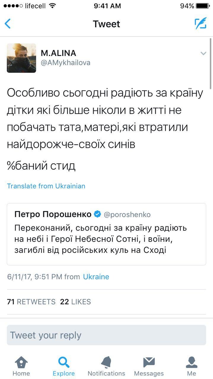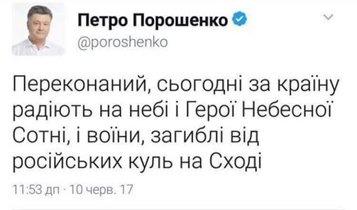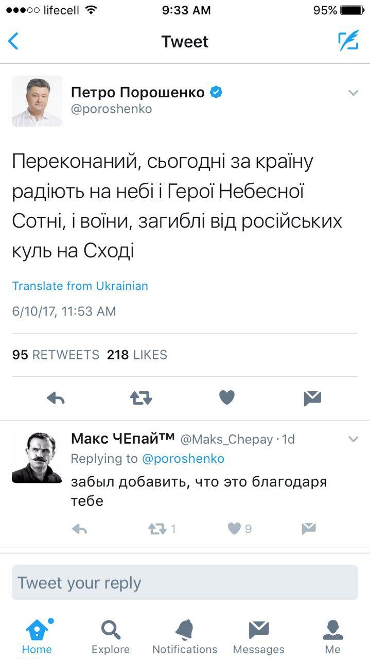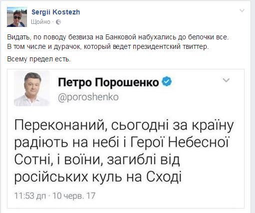 Так, користувачів соцмереж обурив опублікований, але згодом видалений допис з офіційного Твіттеру Президента. У ньому йшлося про те, що безвізу радіють зараз Герої Небесної Сотні і загиблі на війні на сході.Журналісти, волонтери та пересічні громадяни назвали твіт «цинічним» та зауважили, що «всьому має бути межа».