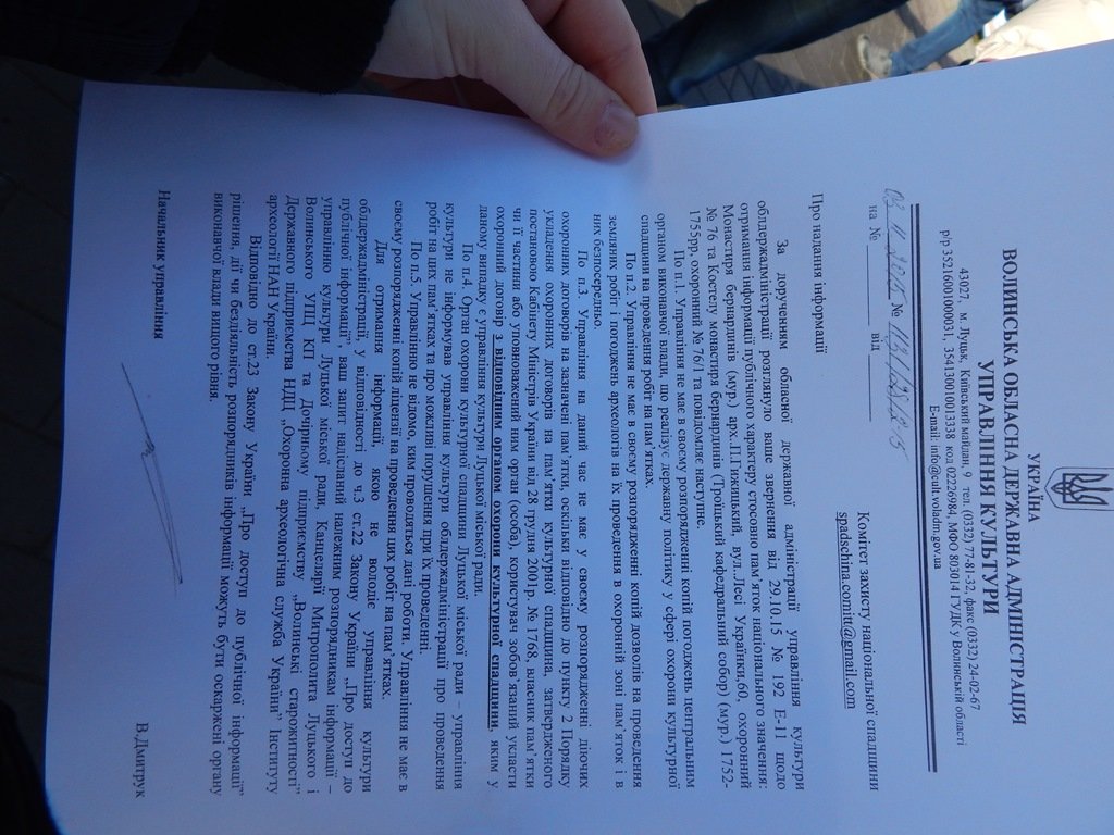 Це грубе порушення З У "Про охорону культурної спадщини" керівництвом Волинської єпархії КП УПЦ. Це невиконання своїх прямих обов" язків Луцькою міською радою, управлінням культури Волинської ОДА, інспекцією будівельного контролю. Прокуратура міста, міліція шукає і не може, бо і не хоче, себе знайти. Влада міська в рік мавпи буде себе вести, як та мавпа на малюнку: заплющила очі, затулила рота, заткнула вуха - плата за вибори, за гріхи. А самі служителі церкви порушили як мінімум три з десяти заповідей Закону Божого. Quo vadis?
