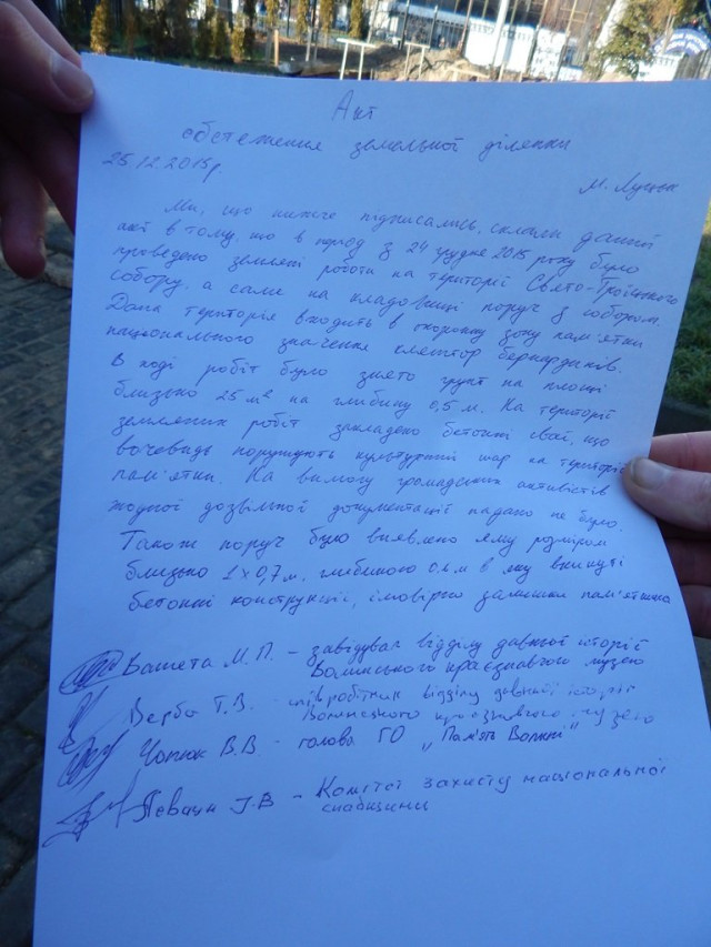 У п’ятницю, 25 грудня, у Луцьку громадські активісти, краєзнавці, депутати призупинили будівельні роботи, які велися на території Свято-Троїцького кафедрального собору, а саме на кладовищі, яке входить в охоронну зону пам’ятки національного значення.