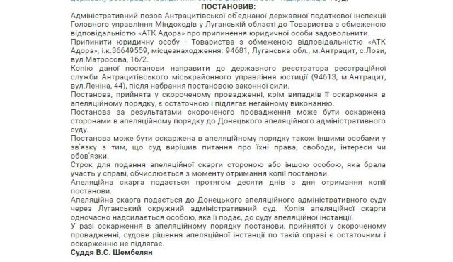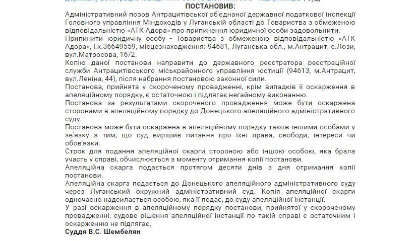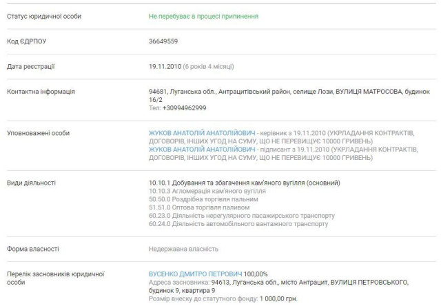 Наголосимо, підприємство зареєстроване на території, яка нині є окупованою. Проте, відповідно до постанови Луганського окружного адміністративного суду від 23 червня 2014 року, юридично діяльність припинена через ненадання звітних документів.