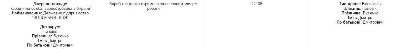 «Вугільну тему» Дмитро Вусенко продовжив вже на Волині, куди переїхав з Луганщини після початку війни на сході. Офіційно він є радником голови державної обласної адміністрації Володимира Гунчика з питань вугільних та паливно-енергетичних накопичень Волинської області. Відповідно до даних декларації, за 2015 рік отримав 22106 гривень зарплати на ДП «Волиньвугілля» (щоправда, потім перевірка виявила, що зарплату йому нараховували безпідставно).Такою є офіційна картина.