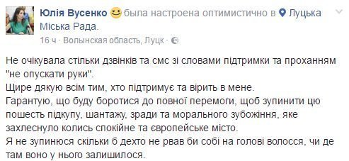 «Не очікувала стільки дзвінків та смс зі словами підтримки та проханням «не опускати руки». Щире дякую всім тим, хто підтримує та вірить в мене. Гарантую, що буду боротися до повної перемоги, щоб зупинити цю пошесть підкупу, шантажу, зради та морального зубожіння, яке захлеснуло колись спокійне та європейське місто.