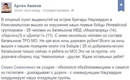 "В опорний пункт висунутої на вістрі бригади Нацгвардії в Комсомольському вийшли з оточення наші перші бійці Іловайского угруповання - 28 чоловік з батальйонів МВС «Миротворець» (14), «Херсон» (3) і «Дніпро-1» (11). З ними кілька людей зі складу батальйонів ТРО МО. Не дарма всю ніч тримали рубіж!", - пише Аваков.