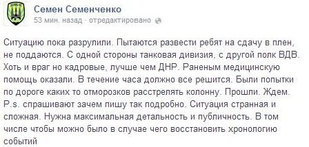 "Намагаються розвести хлопців на здачу в полон, не піддаються. З одного боку танкова дивізія, з іншого полк ВДВ. Хоч і ворог, але кадрові, краще ніж ДНР. Пораненим медичну допомогу надали. Протягом години повинно все вирішиться. Були спроби по дорозі будь то відморозків розстріляти колону. Пройшли. Чекаємо", - написав він.