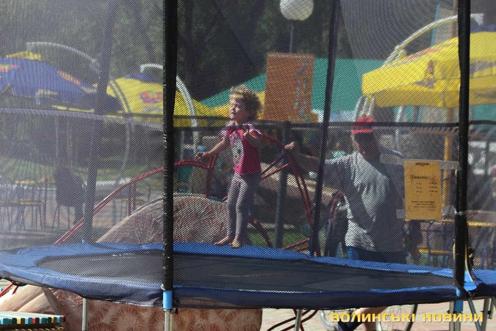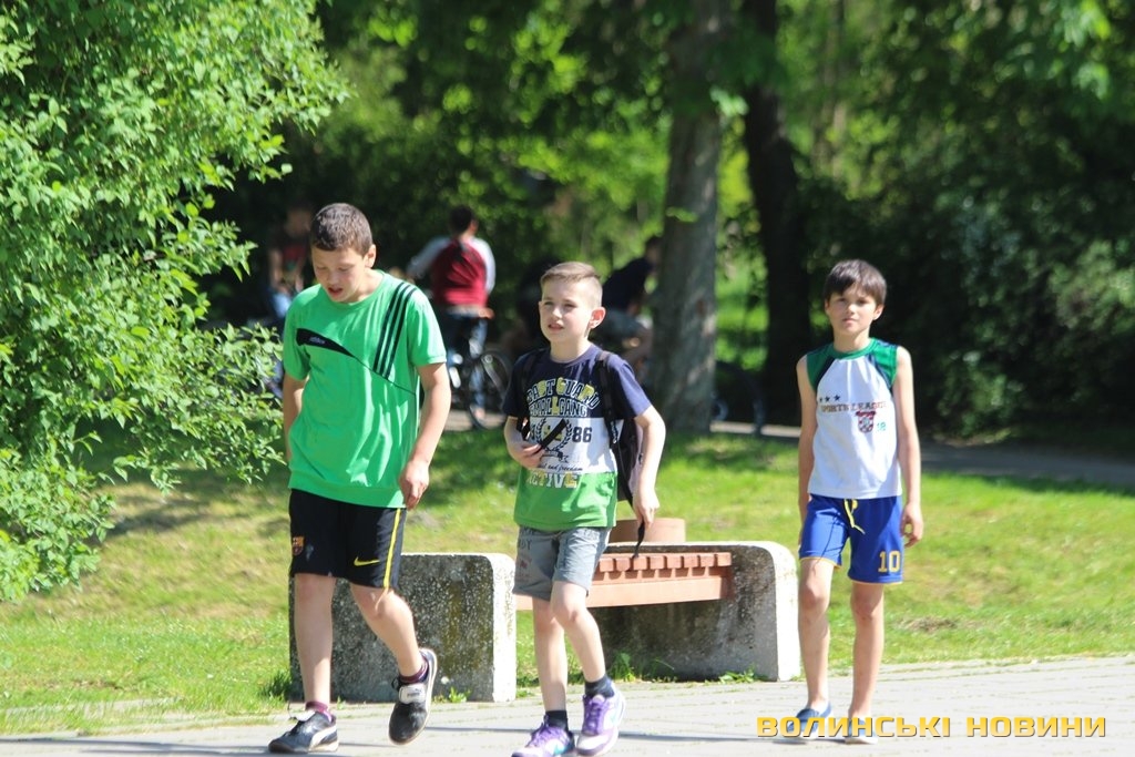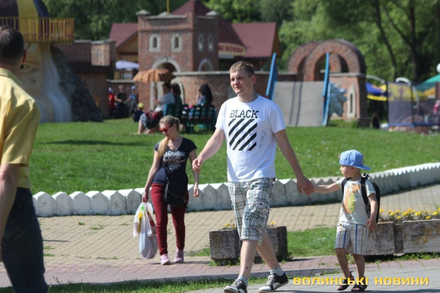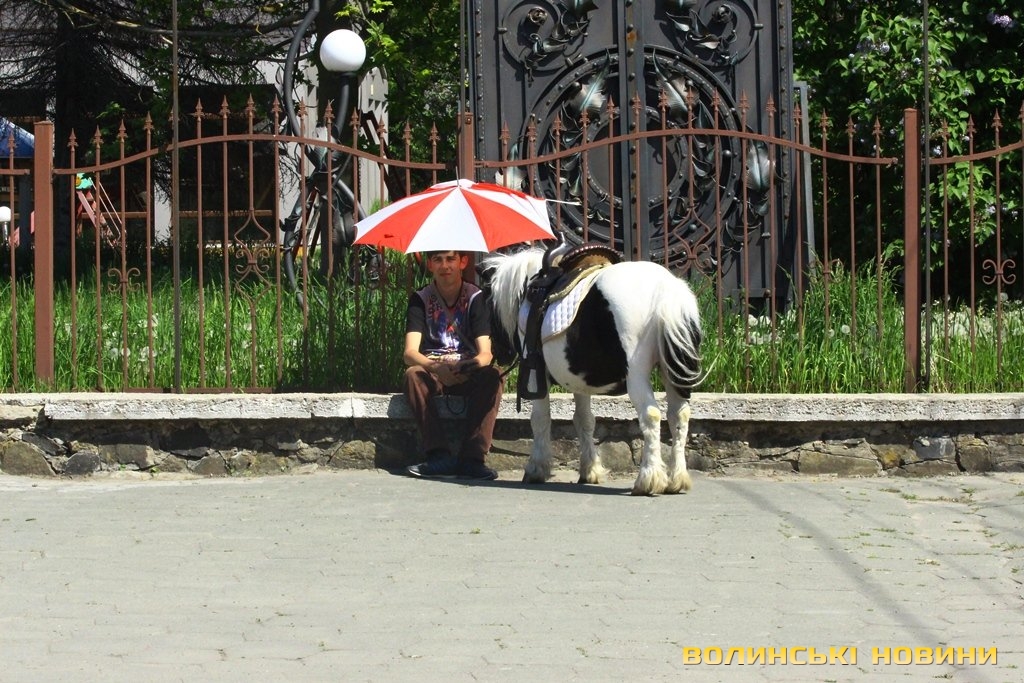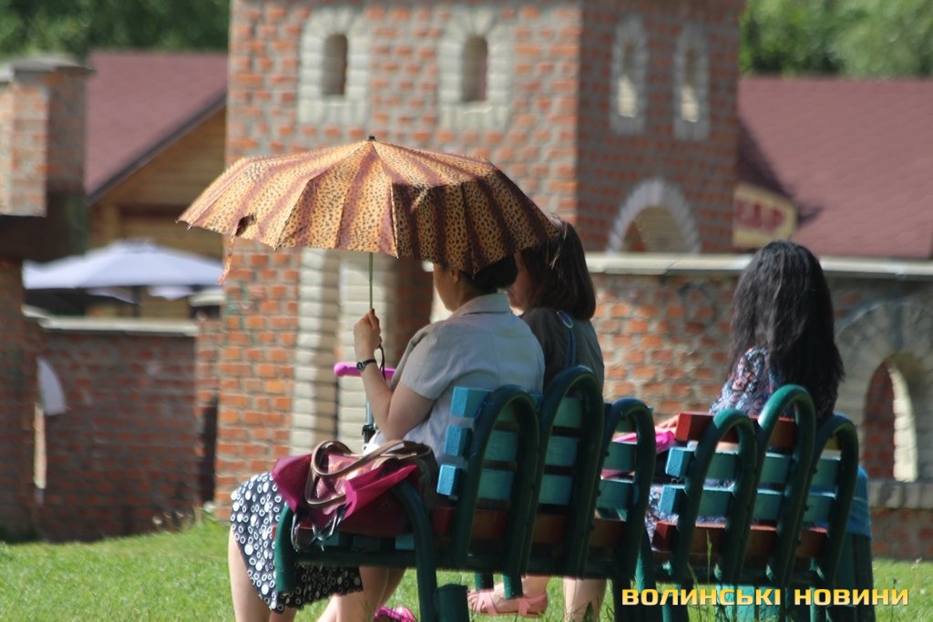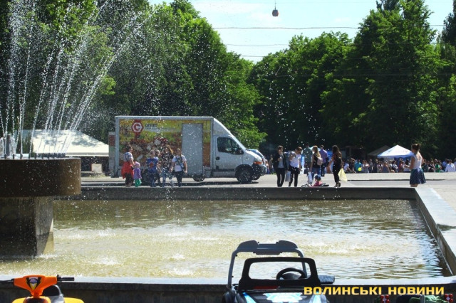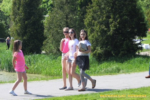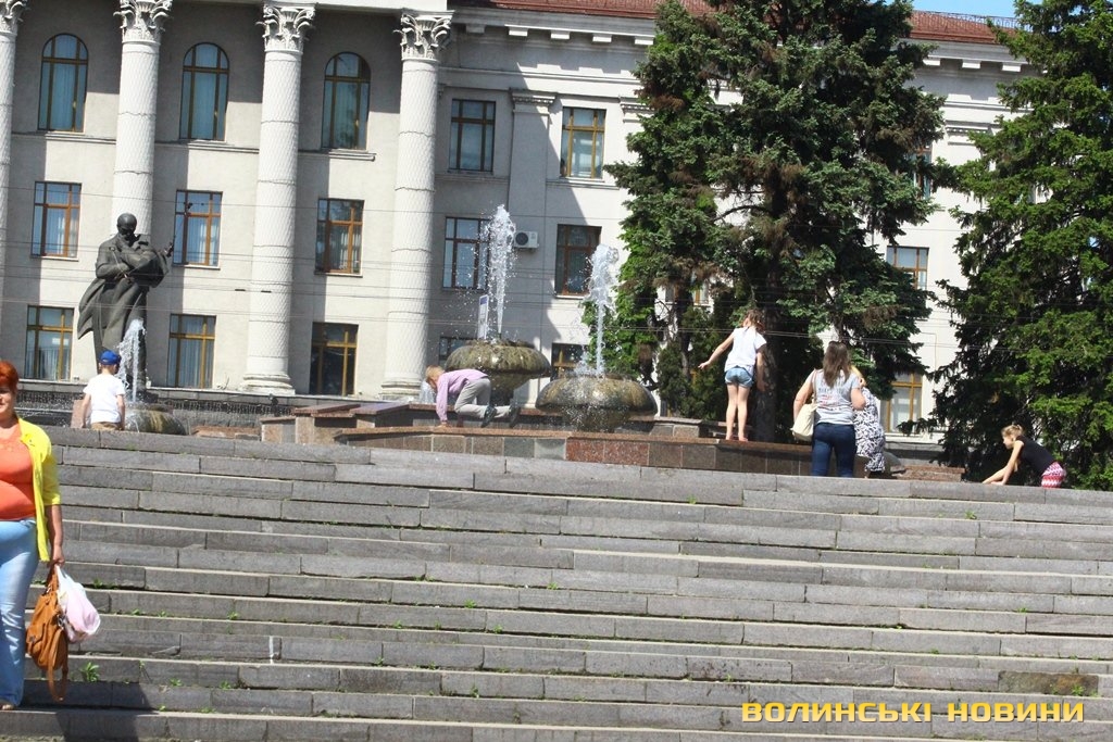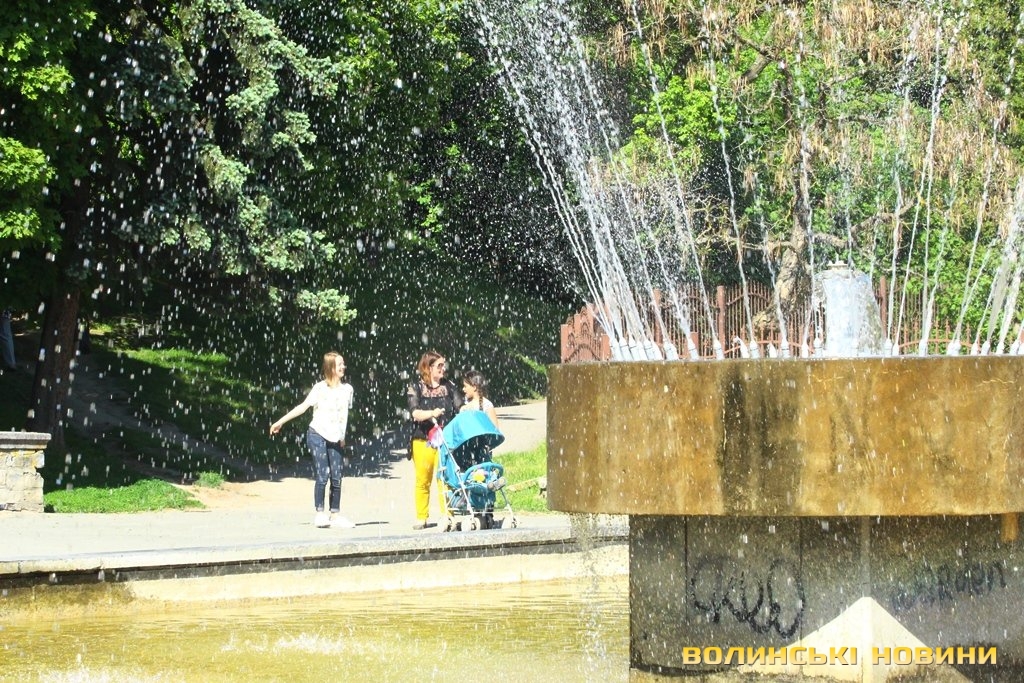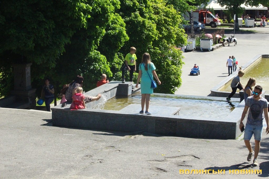 Хто не поїхав за місто – шукав прохолоди в іншому місці. Хто – ховався від спекотного сонця під парасолькою, хто – спробував освіжитися у фонтані.Декого рятувало від спеки морозиво, або ж напої. А біля фонтанчика з питною водою раз по раз утворювалася черга.Навіть чотирилапі теж потерпали від спраги.Хтось вирішив прогулятися разом з малечею, а хтось – покататися на велорикші чи гойдалках. При вході в центральний парк з нагоди Дня Європи встановили сцену, тож відвідувачі споглядали виступи луцьких школярів на міні-версії «Євробачення».
