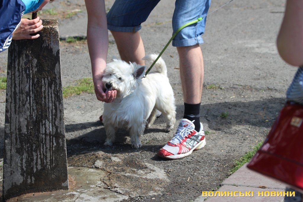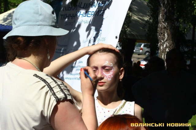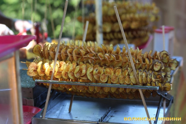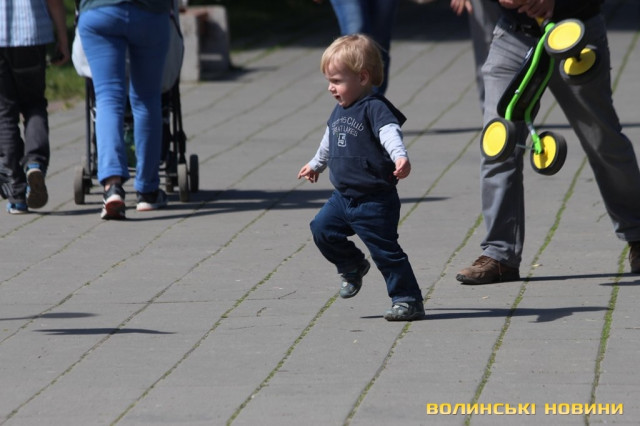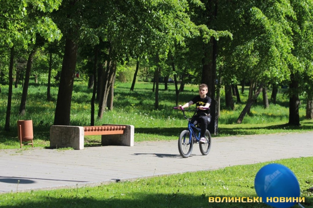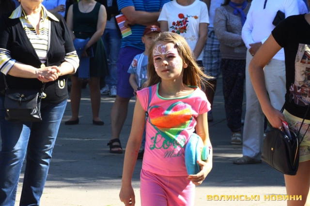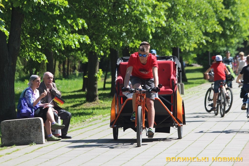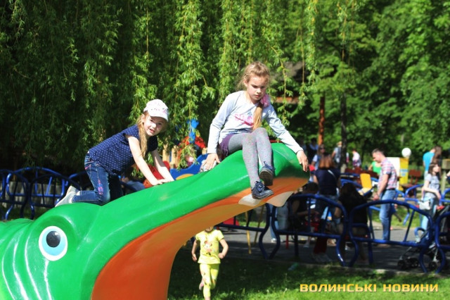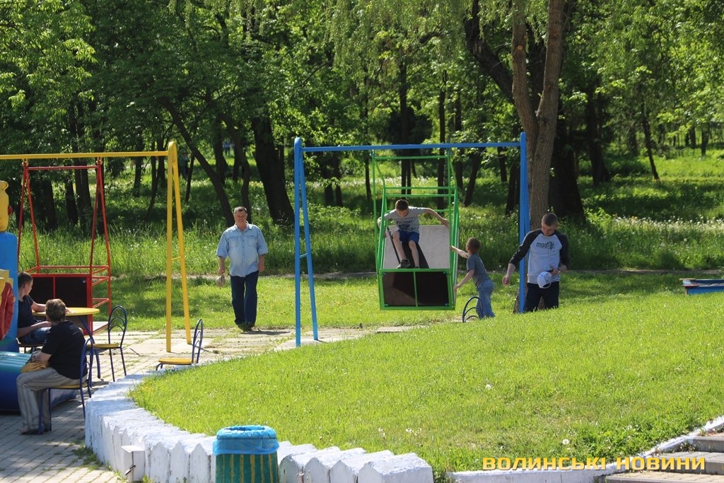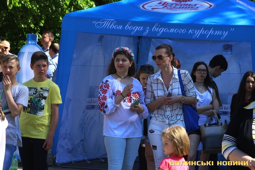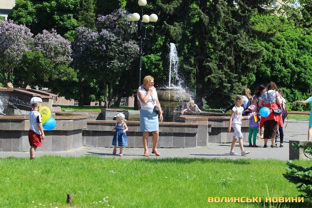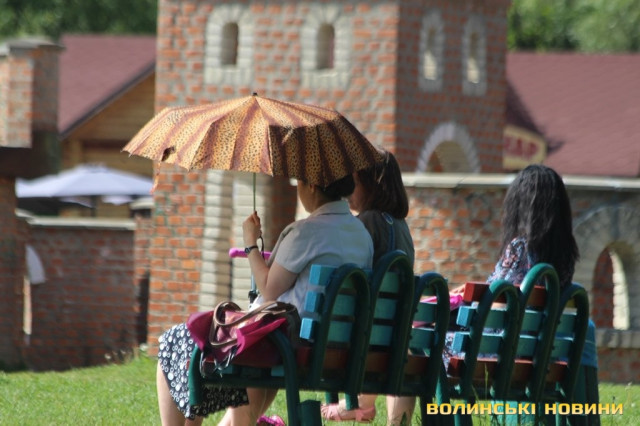 Хто не поїхав за місто – шукав прохолоди в іншому місці. Хто – ховався від спекотного сонця під парасолькою, хто – спробував освіжитися у фонтані.Декого рятувало від спеки морозиво, або ж напої. А біля фонтанчика з питною водою раз по раз утворювалася черга.Навіть чотирилапі теж потерпали від спраги.Хтось вирішив прогулятися разом з малечею, а хтось – покататися на велорикші чи гойдалках. При вході в центральний парк з нагоди Дня Європи встановили сцену, тож відвідувачі споглядали виступи луцьких школярів на міні-версії «Євробачення».