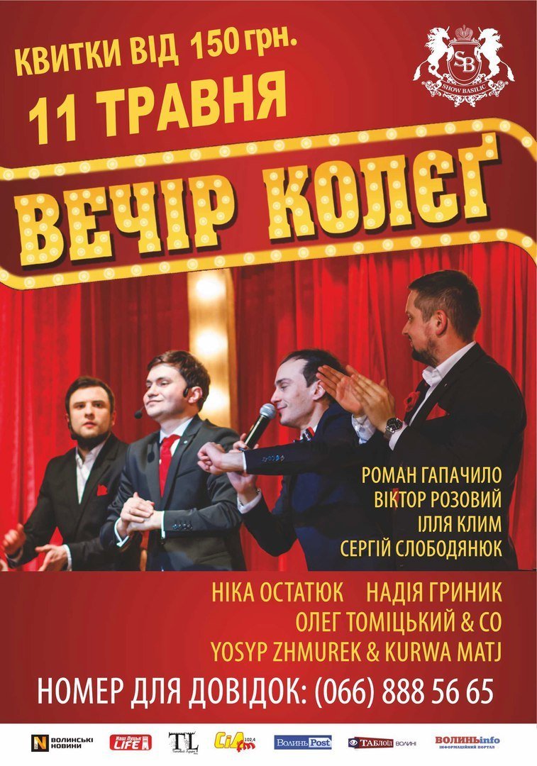 Концерт "Вечір Колєг", який в зв'язку з Великим постом був перенесений з 28 квітня, відбудеться сьогодні, 11 травня, у «Show Basilic» у Луцьку.