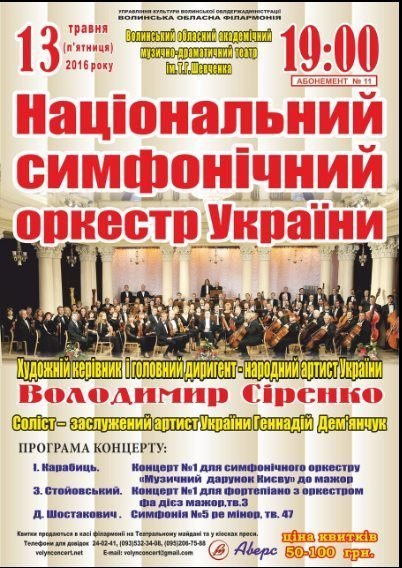 Національний симфонічний оркестр України гратиме у п'ятницю, 13 травня, в Луцьку.