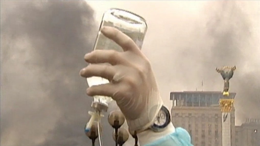 «... Груди! Вiдкрийте йому груди... Швидше... Швидше..." Вiдкрили йому груди. Там рана вiд кулi. Глибока. Кров витiкає. Каска злетiла, волосся русяве розсипалося. Очi блакитнi, як небо над його головою. Схилилися хлопцi над ним. "...Менi не болить... Я -- живий... Не болить... Мамо...». Так українцям показали стрічку про Небесну Сотню.