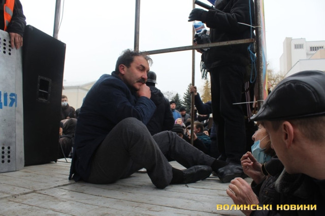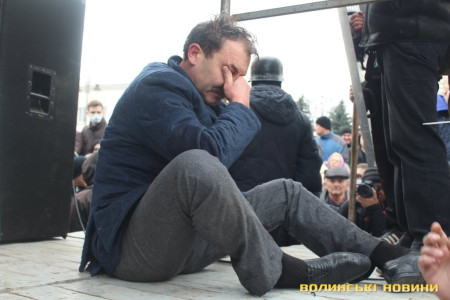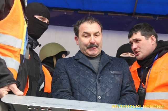 Оскільки голова Волинської облдержадміністрації категорично відмовлявся писати заяву про відставку, незважаючи на вимогу багатотисячного натовпу протестувальників, його силоміць прикували наручниками до металоконструкції на сцені Євромайдану у Луцьку.